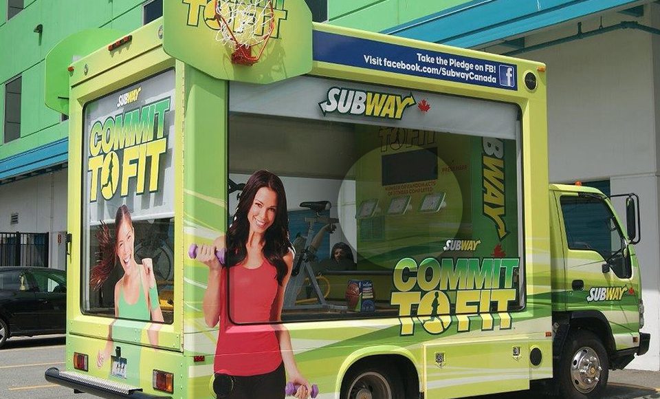 When Subway Restaurants launched their "Commit to Fit" campaign for 2013, they put a truck on the road with more interactive ways to experience and learn about fitness. As you can tell from the photo, every inch of this truck is designed to help sell the message and the interactive iPad displays are no exception. With a custom designed graphic finish on the Tryten iPad kiosk, the displays blend in so seamlessly that we had to highlight them in the picture so that you can see where they are.
